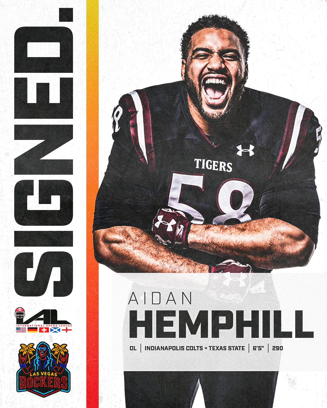 March 25, 2026 (Las Vegas, Nevada) International Arena League, Las Vegas Rockers announced the signing of offensive lineman Aidan Hemphill, adding depth and versatility to the team's offensive line as they prepare for the inaugural season in the International Arena League.