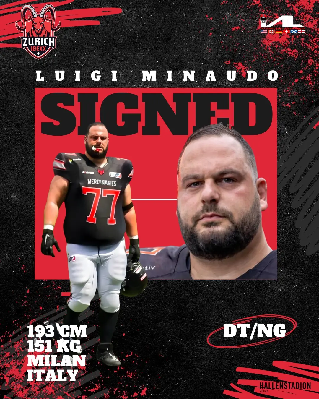 Zürich announced the signing of Luigi Minaudo, a veteran of Italy’s top level American football pipeline, adding size and experience to a roster that is clearly being built for arena football’s most unforgiving area: the interior line.